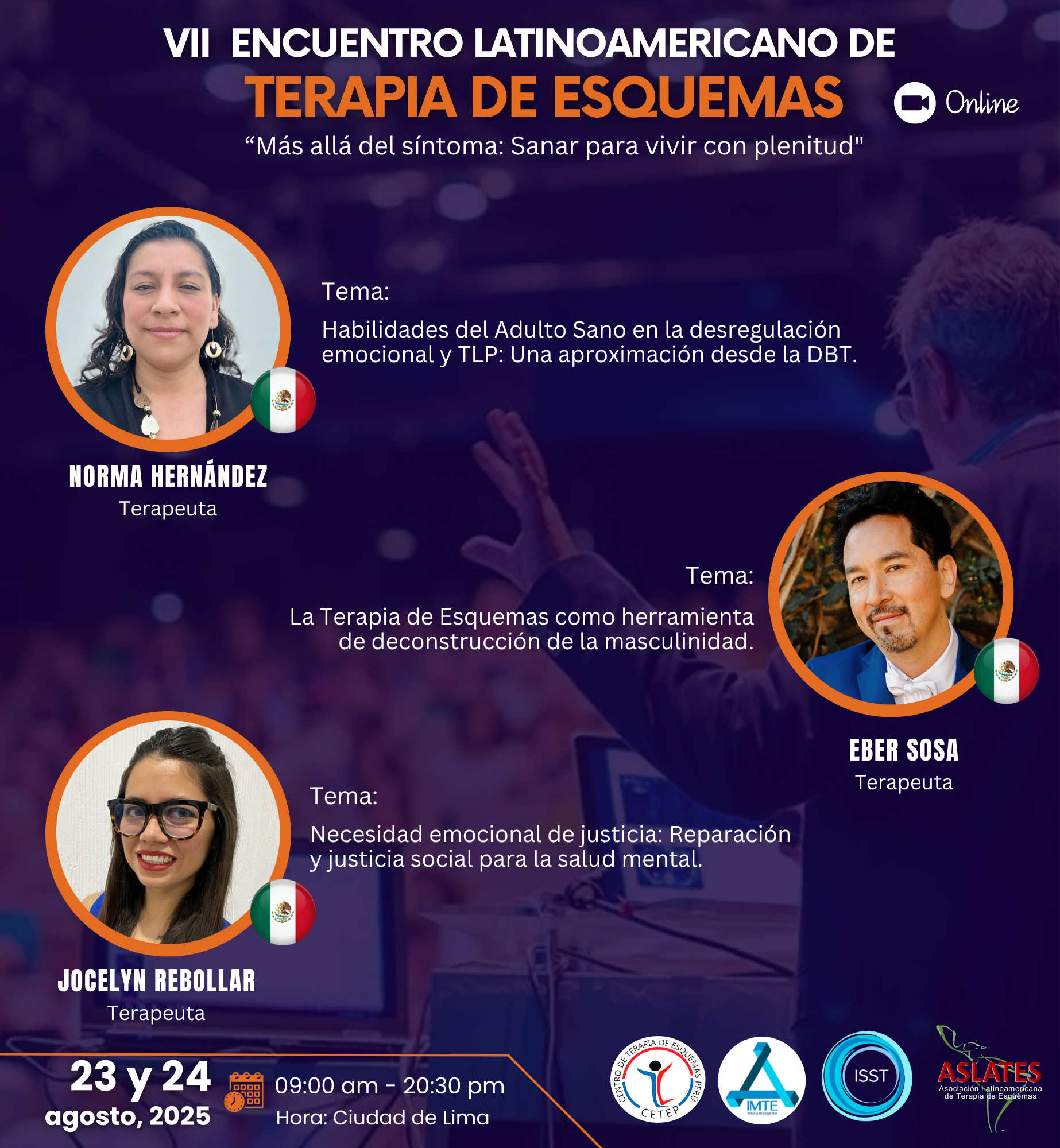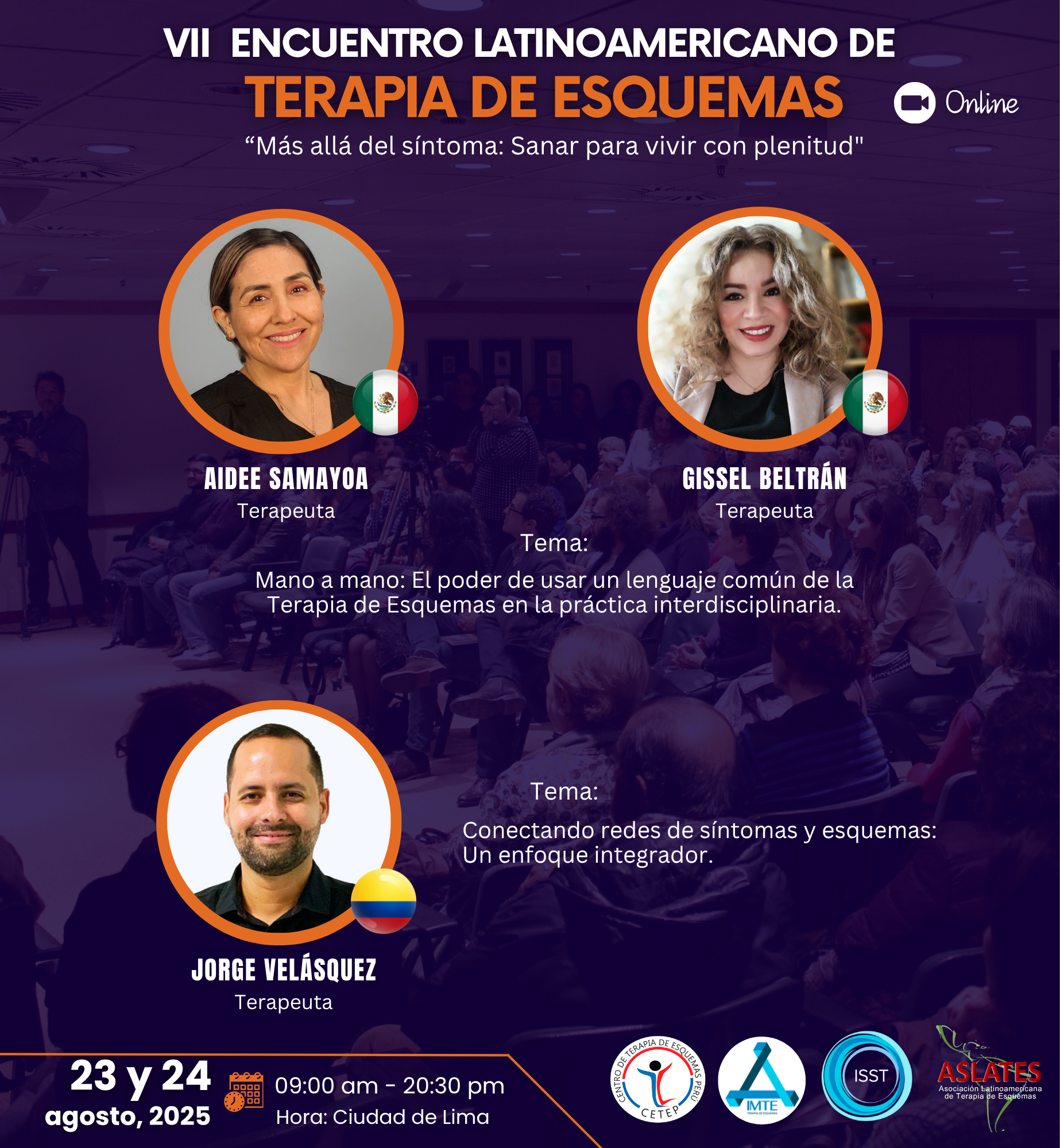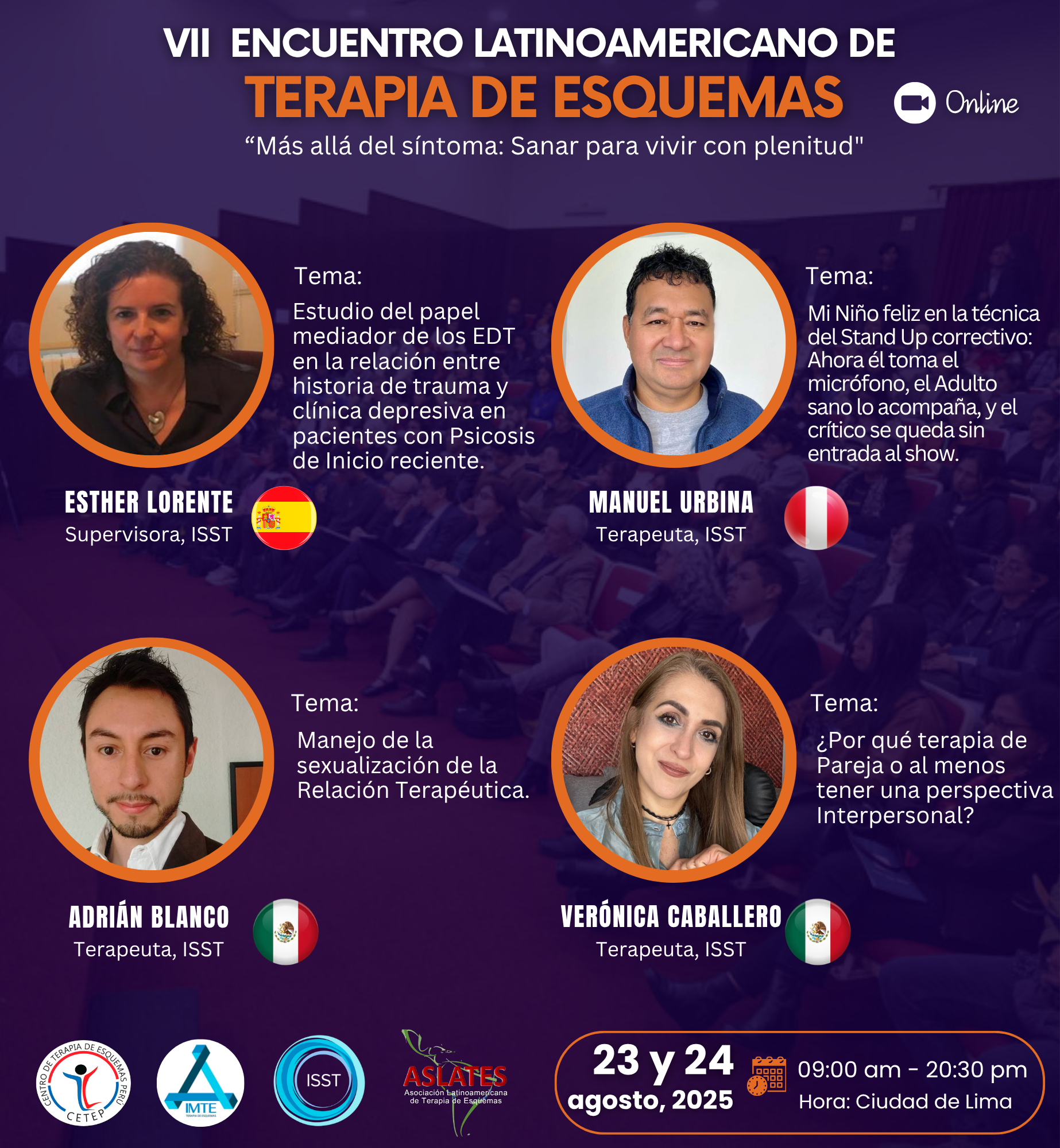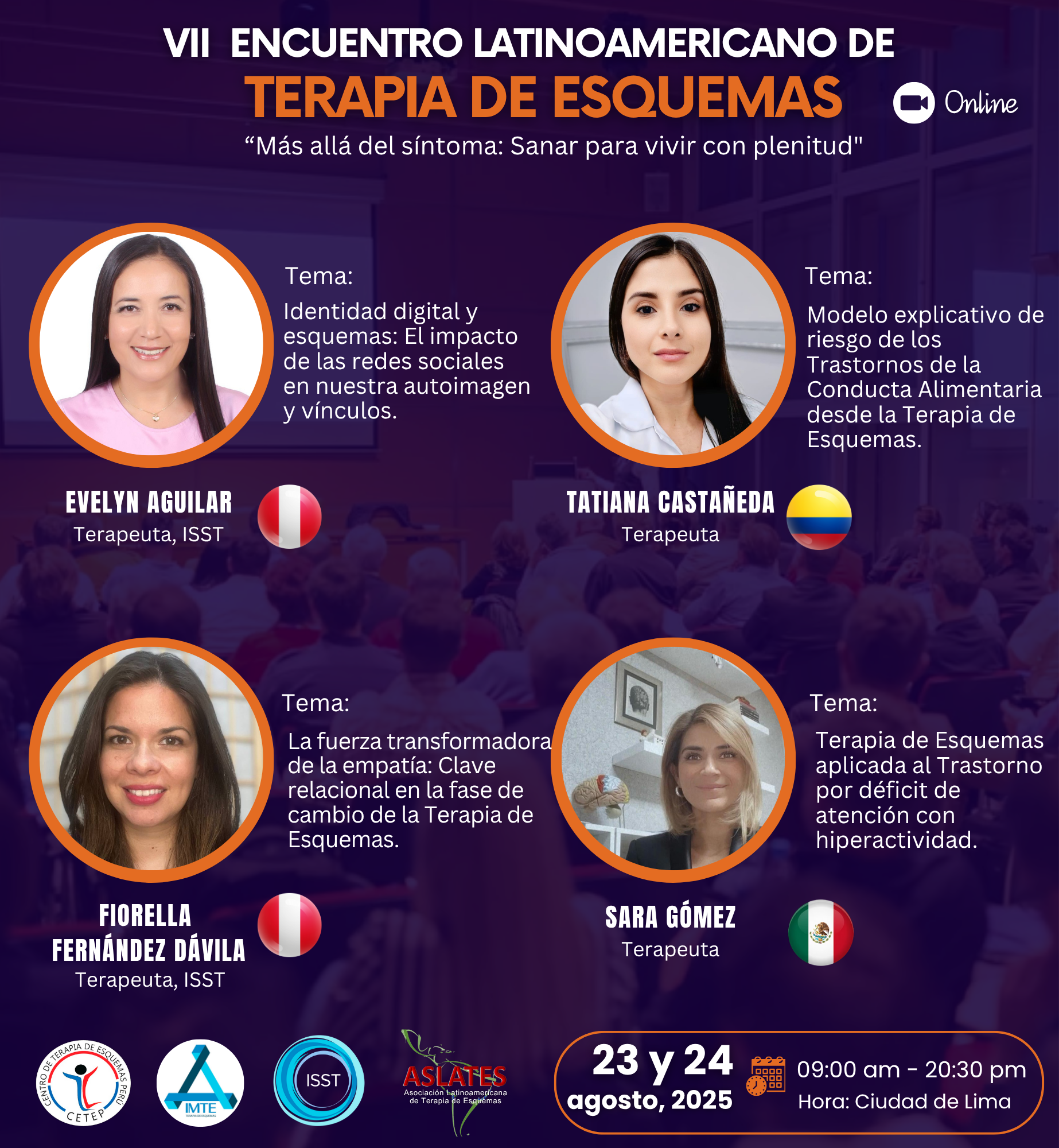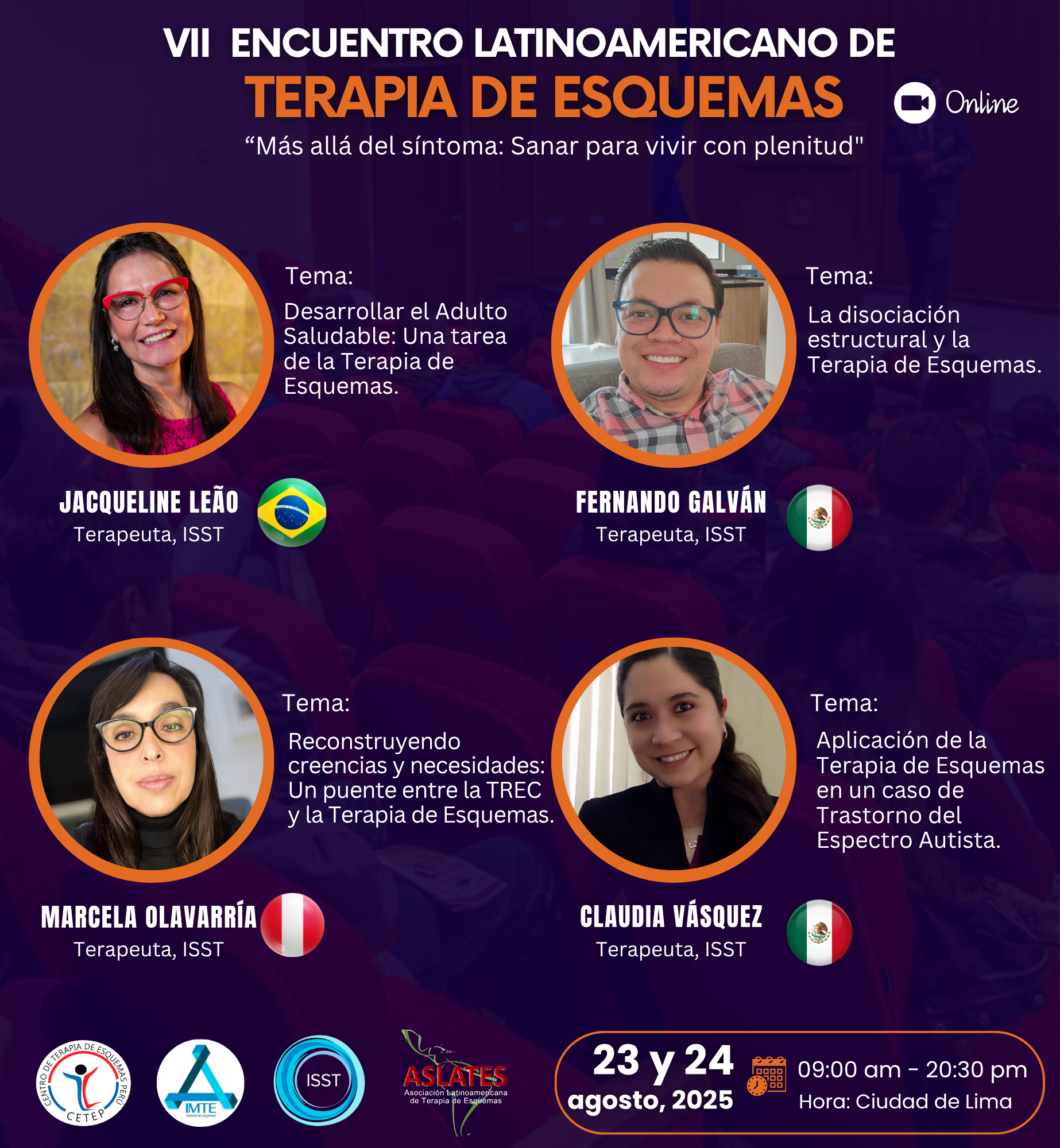 Este evento contará con la presencia de Terapeutas, Supervisores y Certificadores acreditados por la International Society of Schema Therapy, ISST, y miembros de la Asociación Latinoamericana de Terapia de Esquemas, ASLATES, institución que fue fundada por la Dra. Lydia Tineo, QPD.